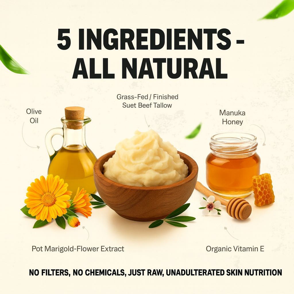 Crafted with grass-fed, grass-finished beef tallow, nourishing Manuka honey, and a potent blend of vitamins A, D, E, and K, plus olive oil—this balm hydrates deeply, restores skin elasticity, reduces the look of wrinkles, and reverses the aging process for a naturally radiant glow.